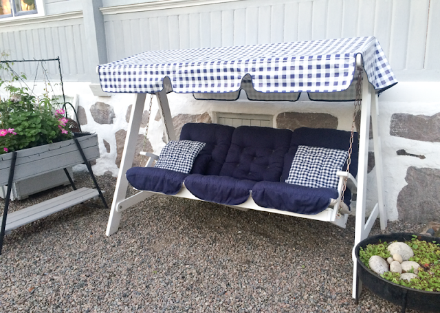Älskar att sova i den, fika i den, läsa i den och kela med hunden i den. Vår hammock har skönt hög rygg och marinblå dynor men dessvärre hade taket, från början svart, börjat bli sjaskigt och solblekt grått. Det såg faktiskt ganska ledset ut. Här är förebilden.